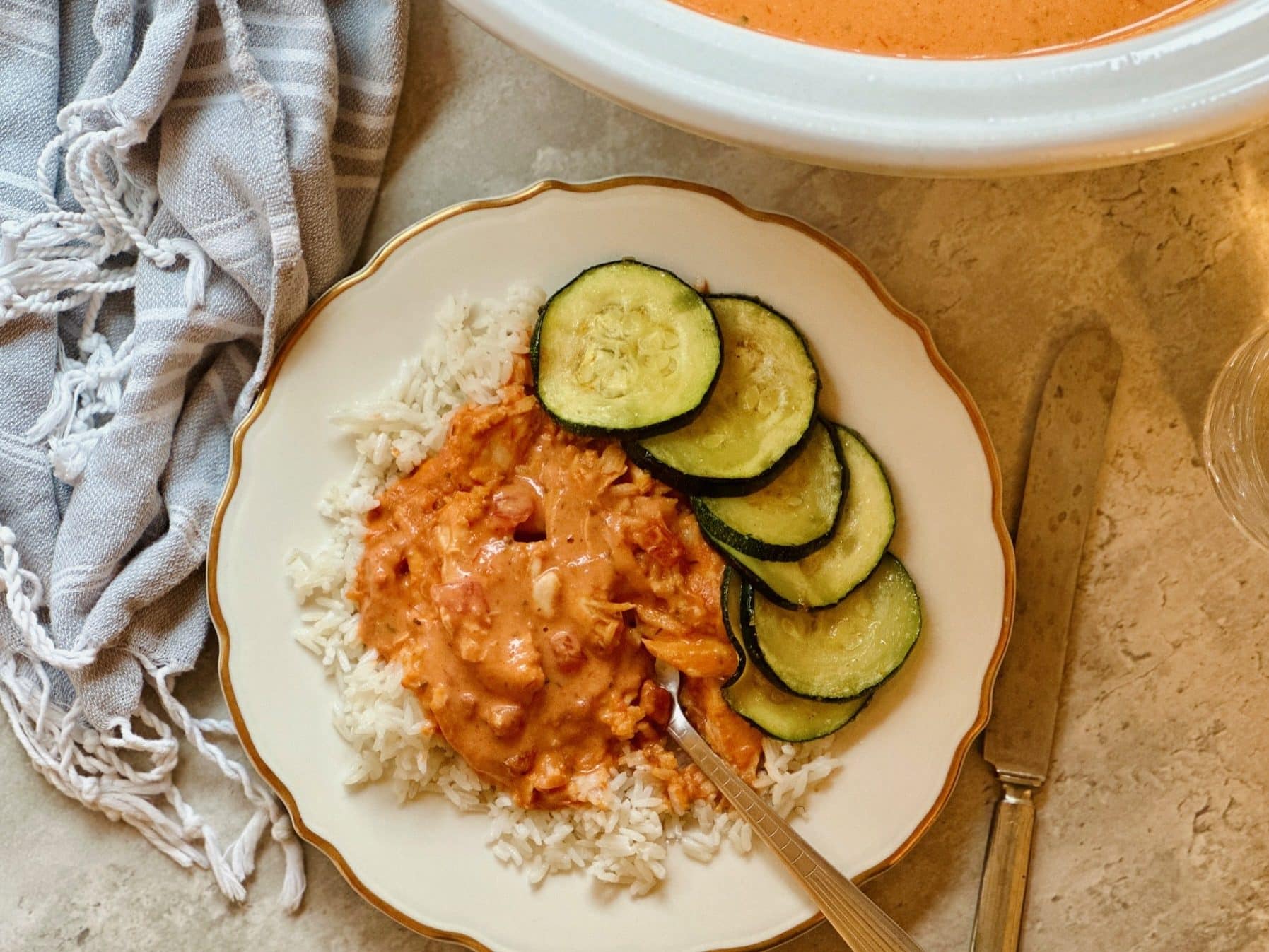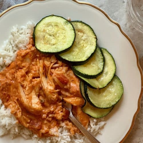 Butter chicken is typically served over hot cooked rice, but we also enjoy it over a bed of egg noodles. Use what you have on hand and be creative! Serve with a side of broiled or steamed veggies for a complete, nutritious dinner. In the pictures for this recipe, I broiled zucchini rounds as a side vegetable, but steamed broccoli is also fabulous.